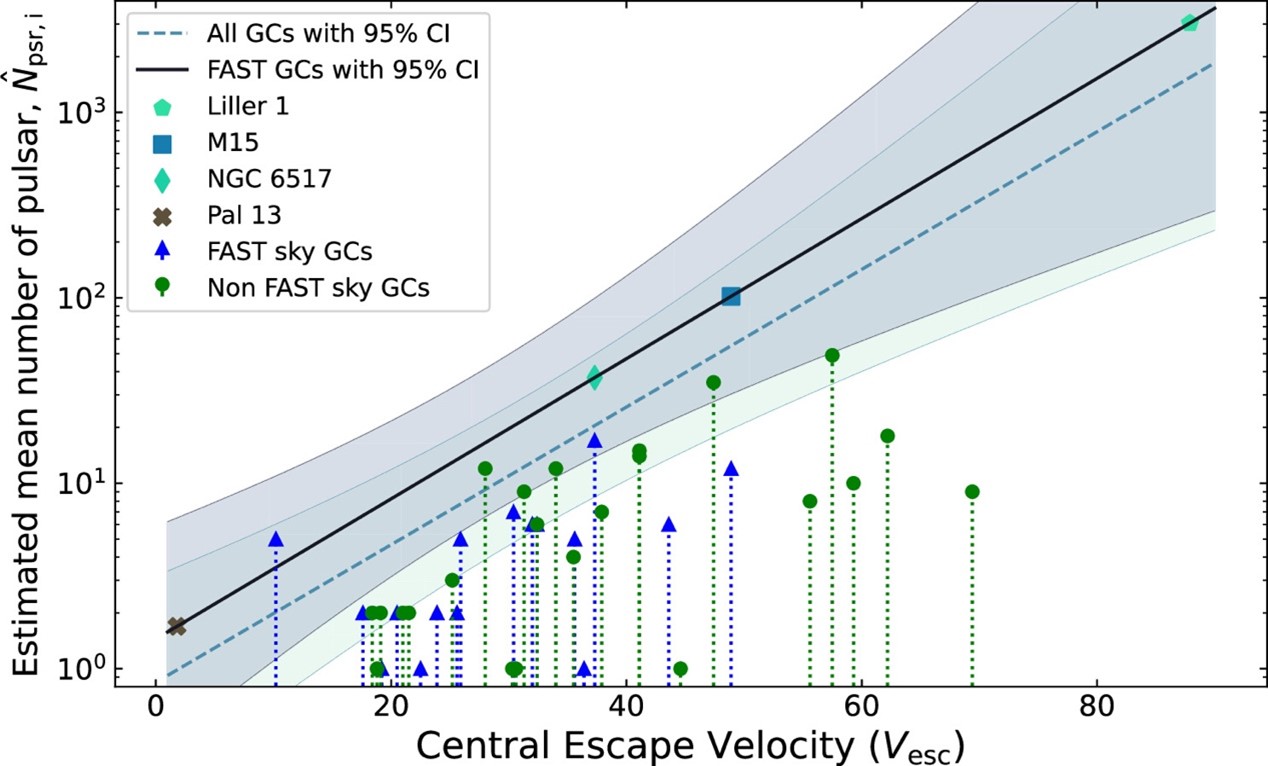 球状星团NGC6517距离我们超过3万光年,是核心塌缩类型的球状星团,具有非常高的核心密度,在FAST开始观测之前其中有4颗已知脉冲星;根据对NGC6517在L波段的射电总流量预测其中的脉冲星总数大约是12颗。凭借空前的灵敏度,FAST已在NGC6517中发现了共17颗脉冲星,使其成为FAST可观测天区内包含已知脉冲星数量最多的球状星团。基于FAST的发现,模拟表明球状星团脉冲星数量和球状星团中心逃逸速度相关(图1)。这一研究工作发表于《天体物理学杂志快报》(Astrophysical Journal Letters, https://iopscience.iop.org/article/10.3847/2041-8213/ad534e),第一完成人为贵州大学硕士研究生尹德江,通讯作者包括贵州大学张立云和国家天文台钱磊、潘之辰,被评为AAS亮点研究工作(AAS NOVA, https://aasnova.org/2024/08/02/seeking-solo-super-fast-pulsars/)。文章的完成单位包括贵州大学、国家天文台、贵州射电天文台等。
