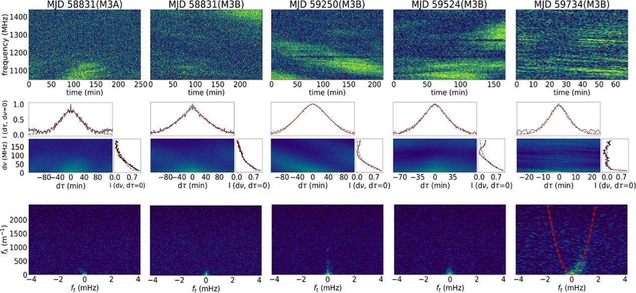 FAST从2019年起即开始监测球状星团M3中的脉冲星,并在其中发现了两颗脉冲星M3E和F(Pan et al. 2021)。根据长期监测,得到了M3A和M3B的闪烁特性,其闪烁特征时标约为1小时,闪烁特征带宽约50 MHz(图2),揭示了这些脉冲星流量强度变化的成因和规律,表明其中的脉冲星受闪烁影响流量会快速变化。M3E和M3F都是毫秒脉冲双星,轨道周期分别为7天和3天,伴星质量在0.2倍太阳质量左右。这一研究工作发表于天体物理期刊(Astrophysical Journal, https://iopscience.iop.org/article/10.3847/1538-4357/ad5a82),第一完成人为贵州大学硕士研究生李保达,通讯作者包括贵州大学张立云,新疆天文台姚菊枚和国家天文台钱磊、潘之辰,被评为AAS亮点研究工作(AAS NOVA, https://aasnova.org/2024/09/27/monthly-roundup-extreme-objects-pulsars-and-magnetars/)。文章的完成单位包括贵州大学、新疆天文台、国家天文台和贵州射电天文台等。